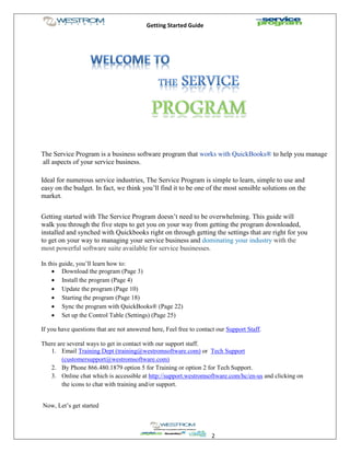 The document provides step-by-step instructions for getting started with The Service Program software. It covers downloading, installing, and updating the software. It then explains how to sync the program with QuickBooks to import customer and inventory data. Finally, it reviews how to configure the program settings to customize it for the user's business needs.