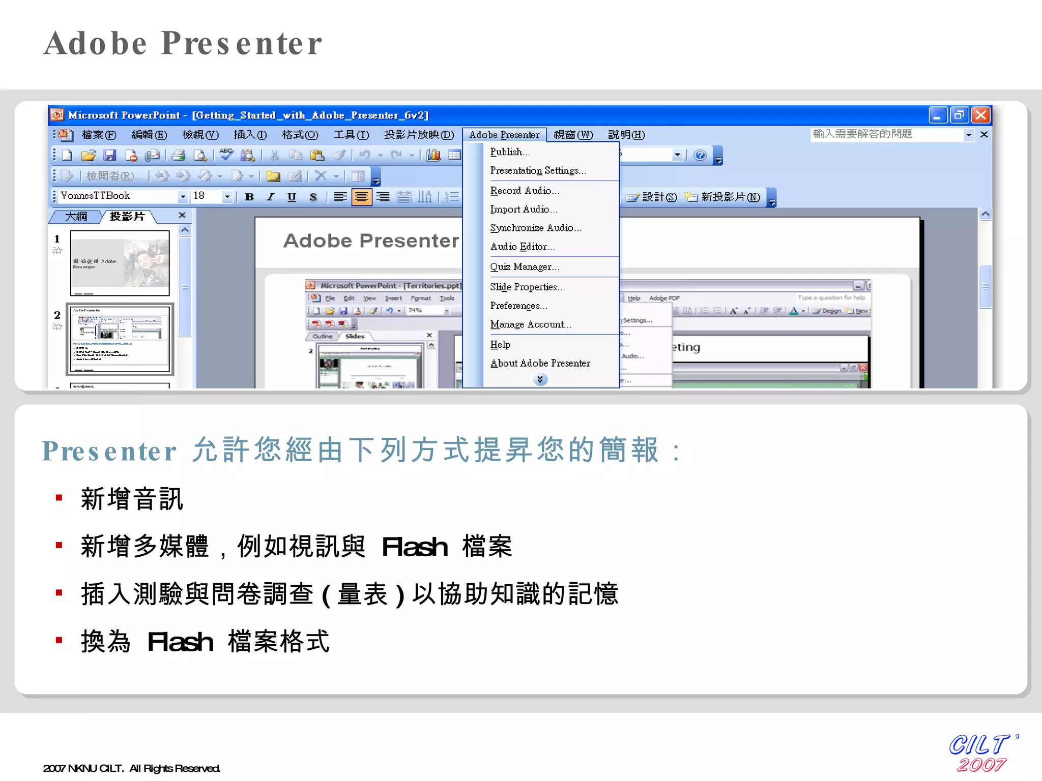 允許您經由下列方式提昇您的簡報: 新增音訊 新增多媒體,例如視訊與 Flash 檔案 插入測驗與問卷調查 ( 量表 ) 以協助知識的記憶 換為 Flash 檔案格式