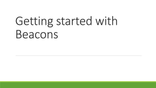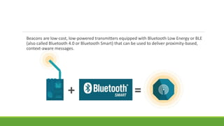 Beacons are low-cost Bluetooth transmitters that can deliver proximity-based messages by transmitting signals to nearby devices, allowing those devices to determine their proximity to the beacon. Beacons do not transmit content directly but enable devices to figure out their proximity, allowing location-based apps to provide contextual information to customers based on their location in a store. iBeacon is a specific Bluetooth technology used by Apple devices to detect beacons, while beacons are the physical hardware devices that transmit and receive Bluetooth low energy signals.