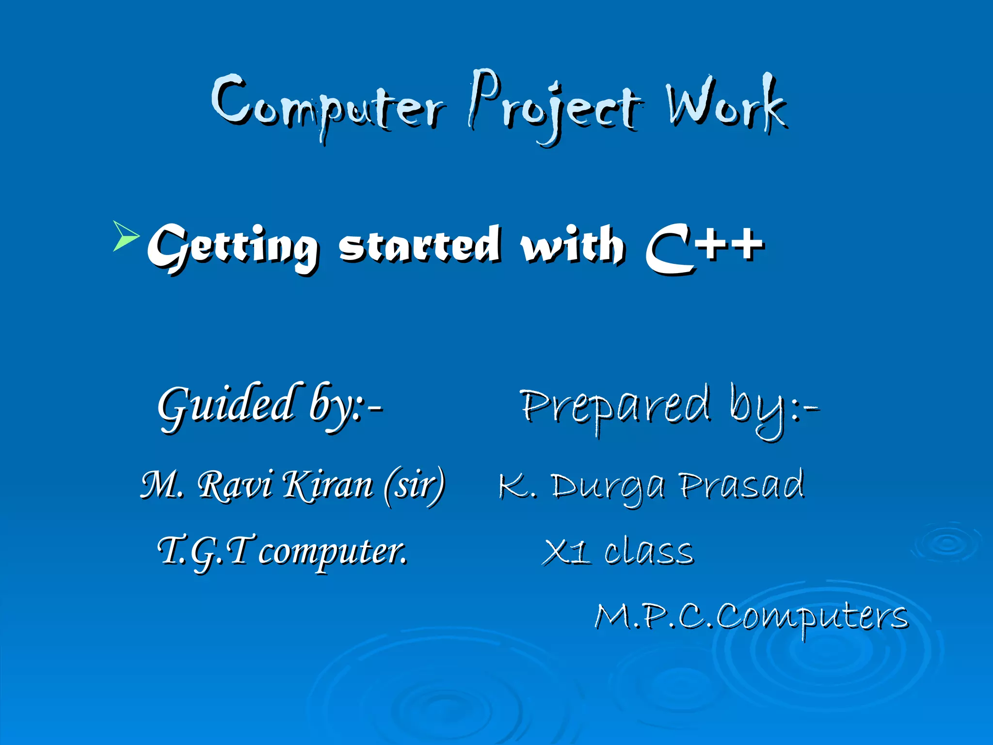 This document provides an introduction to C++ programming, covering key concepts like characters, tokens, keywords, identifiers, literals, operators, input/output, variables, comments, and common errors. It explains that C++ was created by Bjarne Stroustrup in the 1980s as an extension of C with object-oriented features from Simula 67.