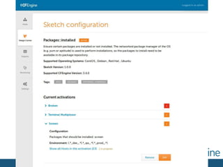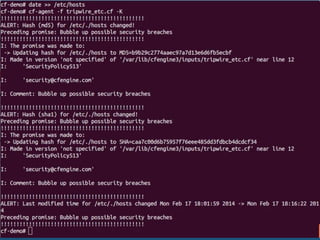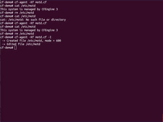 The document outlines the fundamentals of infrastructure automation using CFEngine, detailing its components, historical development, and core concepts like promise theory and convergence. It emphasizes the benefits such as improved productivity, reduced costs, and enhanced security through real-time compliance and system management. Additionally, it provides examples of using CFEngine for file security, editing files, and installing software packages.
