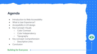 The document outlines a webinar focused on web accessibility, providing an introduction to key concepts such as user experience, visual accessibility, and comprehension. It emphasizes the importance of following the WCAG 2.2 guidelines, specifically addressing color contrast, typography, and descriptive linking for improved accessibility. Additional resources and upcoming sessions for further learning are also shared.