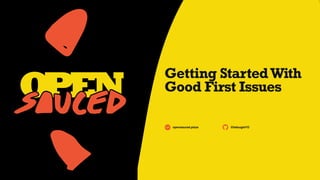 The document discusses how to get started with contributing to open-source projects, emphasizing the importance of 'good first issues' which have clear paths to solutions. It provides links to resources for finding such issues, including the Open Sauced platform, Hacktoberfest, and various GitHub repositories. The message reinforces that contributing to open-source depends on community involvement and encourages engagement through discussions and further exploration of available resources.