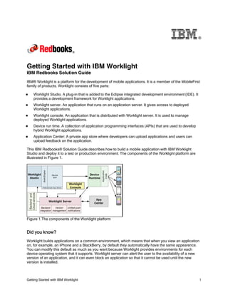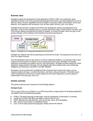 IBM Worklight is a platform for developing hybrid mobile applications. It consists of five main components: Worklight Studio, Worklight Server, Worklight Console, device runtime, and Application Center. Worklight Studio is an Eclipse plugin that provides an IDE for developing applications using web technologies like HTML5, JavaScript, and CSS as well as native device APIs. The Worklight Server manages applications and communication between mobile devices and back-end systems. The Worklight Console is used to manage applications and adapters deployed to the Worklight Server. Device runtime provides APIs for features like authentication, security, and analytics. Application Center is a private app store for feedback and early testing.