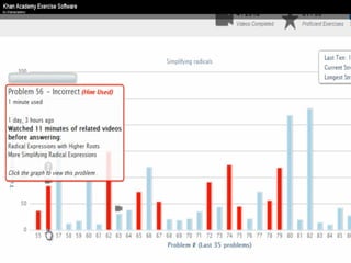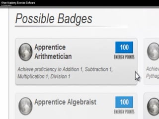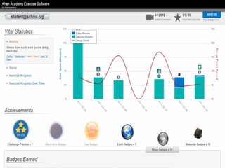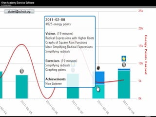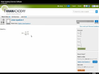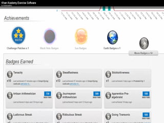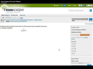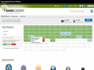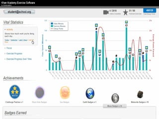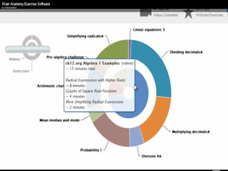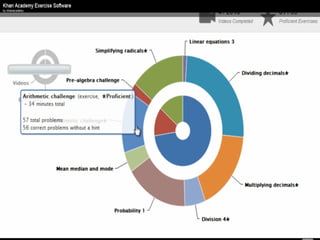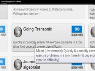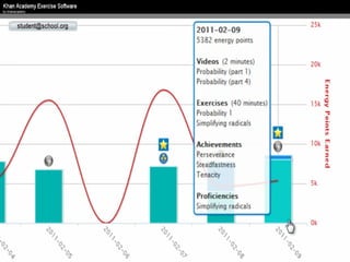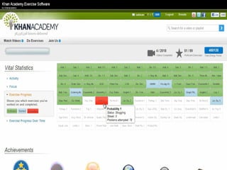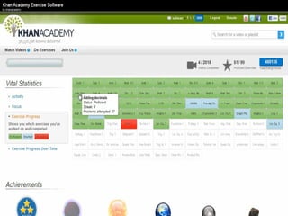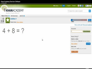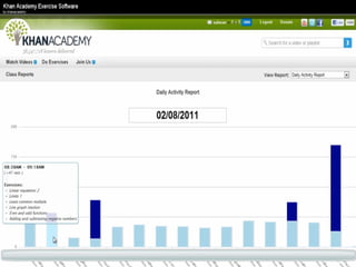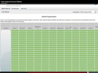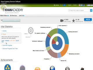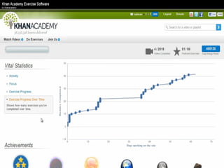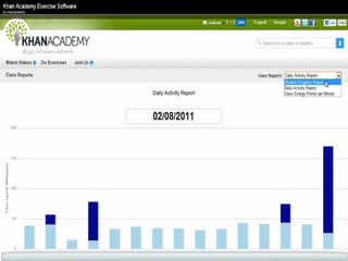 The document presents an overview of how to get started with Khan Academy, emphasizing its benefits for students, parents, and teachers through custom profiles, progress tracking, and formative assessments. It outlines the steps for setting up accounts, engaging students with various activities, and utilizing Khan Academy's resources effectively in the classroom. Additionally, it highlights strategies for goal setting, project-based learning, and the use of activity reports for monitoring student progress.
