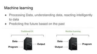 The document provides an overview of machine learning, including definitions, types of machine learning algorithms, and the machine learning process. It defines machine learning as using algorithms to learn from data and make predictions. The main types discussed are supervised learning (classification, regression), unsupervised learning (clustering, association rules), and deep learning using neural networks. The machine learning process involves gathering data, feature engineering, splitting data into training/test sets, selecting an algorithm, training a model, validating it on a validation set, and testing it on a held-out test set. Key enablers of machine learning like large datasets and computing power are also mentioned.