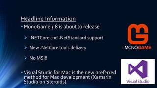MonoGame 3.8 is releasing with .NET Core and .NET Standard support. Visual Studio for Mac is now the preferred method for Mac game development. The session covers getting started with MonoGame on Visual Studio for Mac to develop games for Windows, Linux, Android, iOS, and MacOS. Key steps include installing Visual Studio for Mac with the necessary modules, installing MonoGame templates and tools, and requirements for building to each platform like the Android and iOS SDKs. Testing on multiple devices and early market engagement are also advised.