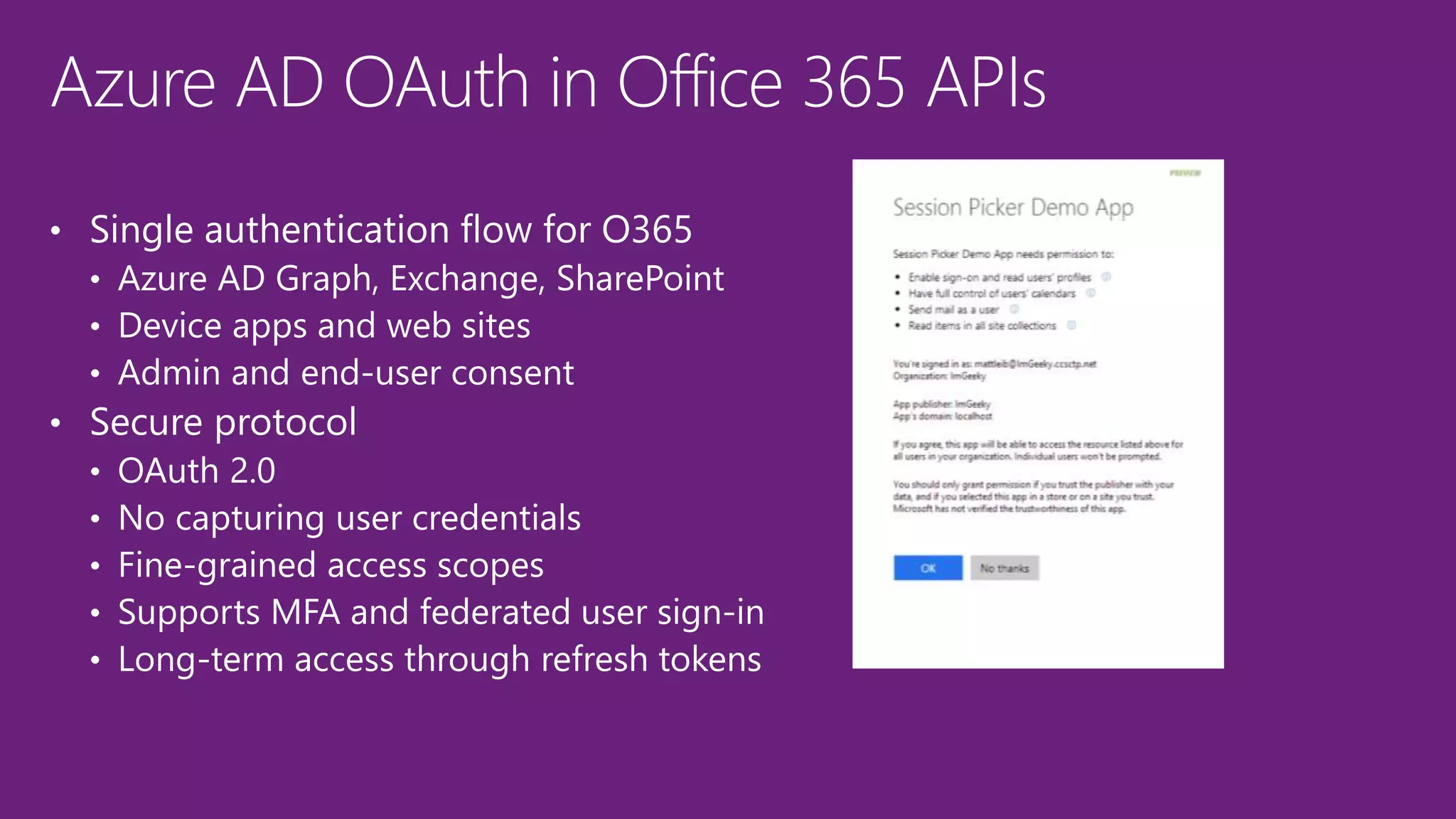 The document contains information about the Microsoft Graph API including supported entities, collections, and actions for various services like Outlook, Calendar, Contacts, and Drive. It also includes examples of URLs to access different data through the API like getting messages from the inbox, getting events after a particular date, and getting a contact by name.