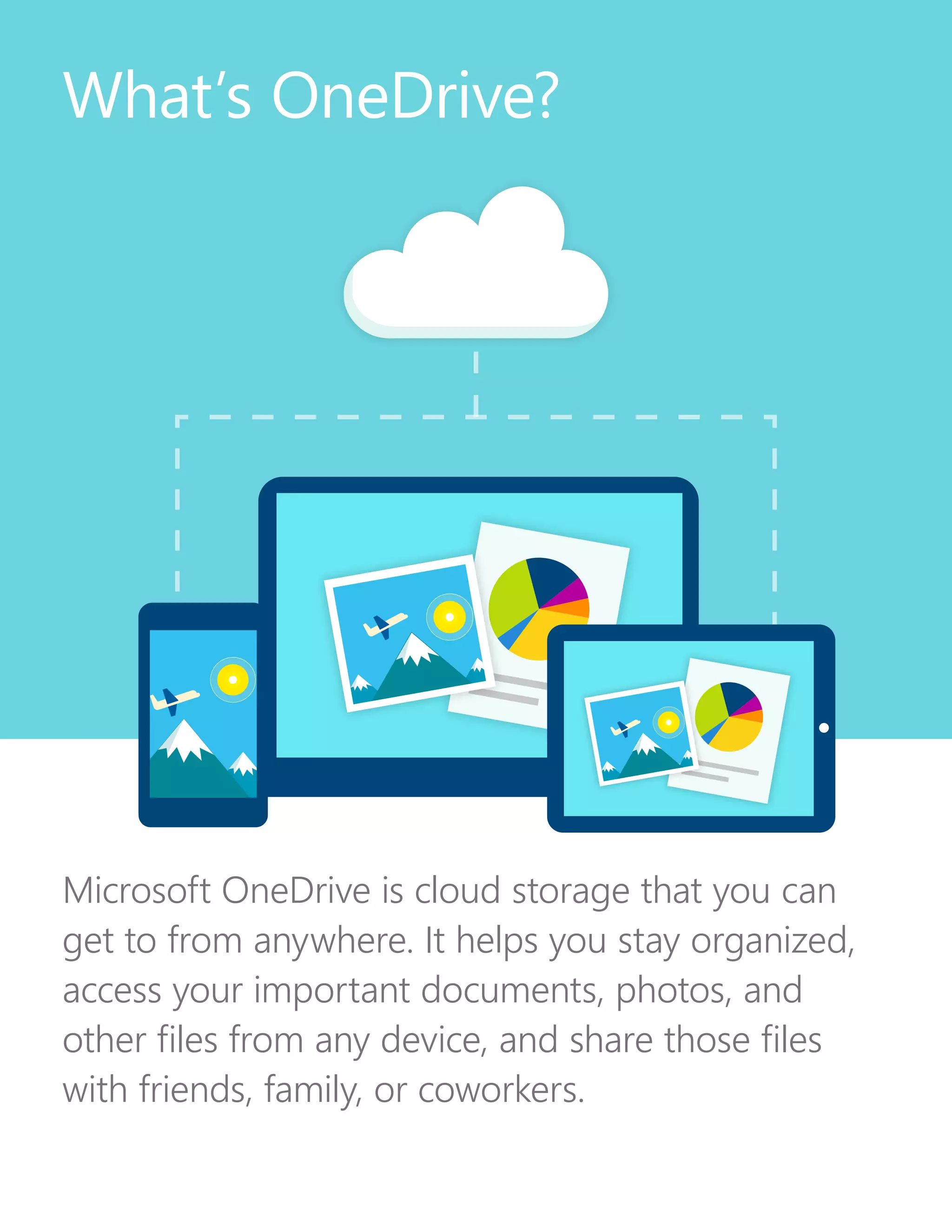 OneDrive is cloud storage that allows users to access and share files from any device with an internet connection. Files can be accessed through OneDrive's web interface or mobile apps for Android, iOS, and Windows phones. The OneDrive folder on a user's computer syncs files to the cloud so they are always up to date across devices. Users can add files by dragging them into the OneDrive folder or mobile app, and share links to files and folders with others.