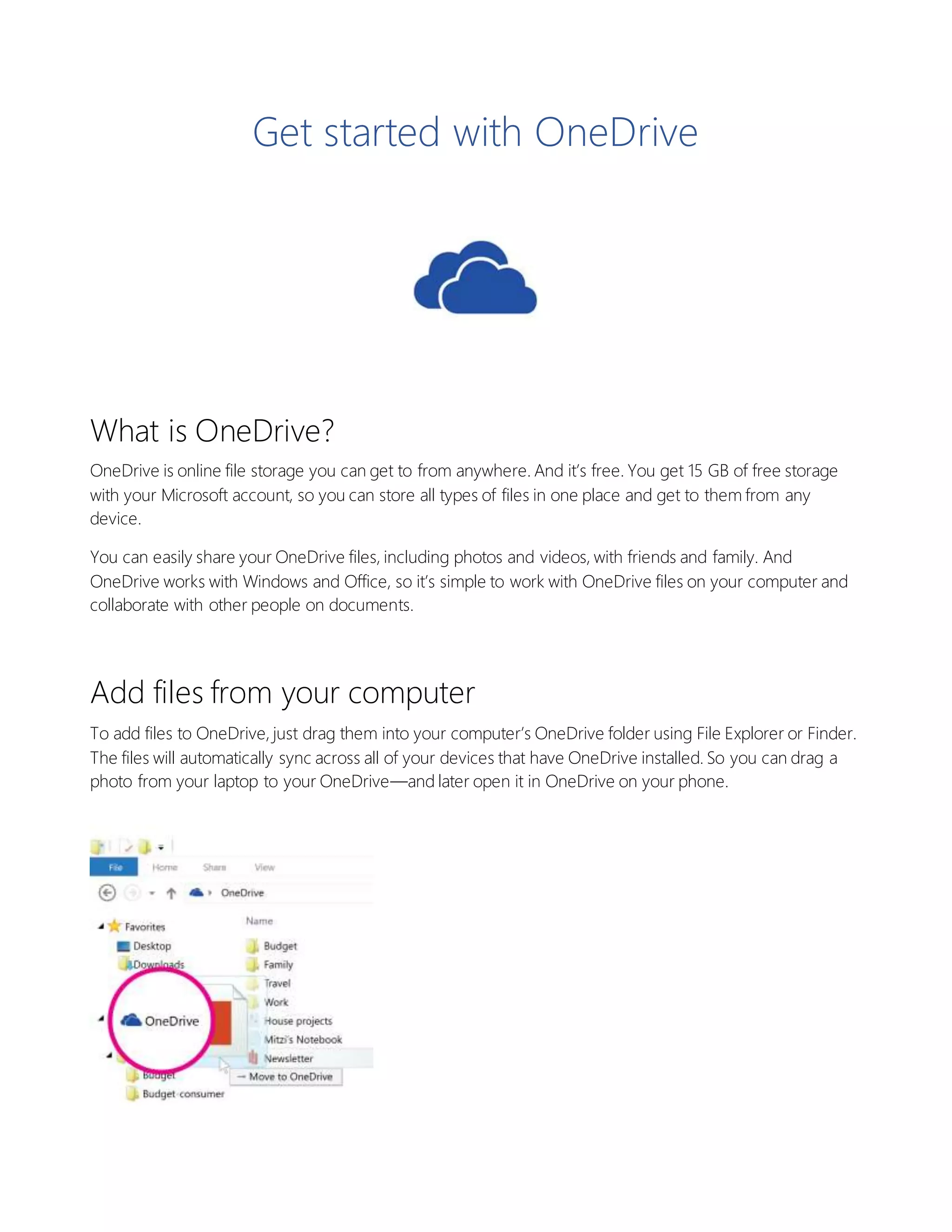 OneDrive is a free online file storage service that allows users to store and access files from any device. Files can be added to OneDrive from a computer by dragging them into the OneDrive folder, from a phone or tablet using the OneDrive app, or from any device using the OneDrive website. Once files are in OneDrive, they can be easily shared or collaborated on with others. OneDrive also integrates with Windows and Office programs to allow files to be accessed and edited from any device.