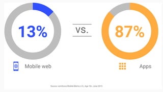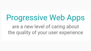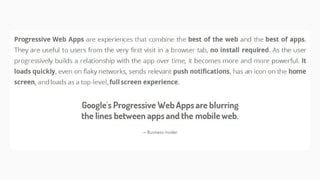The document provides an overview of Progressive Web Apps (PWAs) and their benefits, emphasizing the low engagement rates of native apps and the potential for increased revenue through web apps. It outlines the essential features of PWAs, such as app-shell, HTTPS, and service workers, and presents various storage options like cookies and IndexedDB. Additionally, it includes links to demos and case studies for practical implementation guidance.