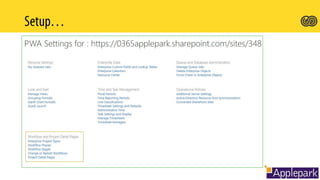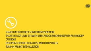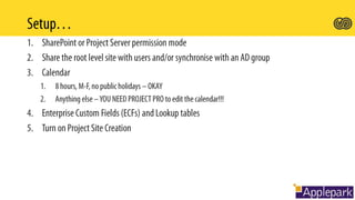 This document provides an introduction to Microsoft Project and Project Server installation. It outlines the key components of a Project Server implementation including setting up the Project Web App (PWA), assigning licenses, and configuring permissions for administrators, project managers, executives and team members. It also compares the functionality of Project Online, Project Pro and Project Lite and when each would be used.