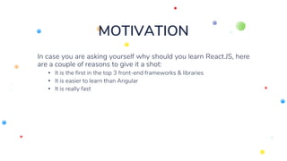 The document outlines the advantages of learning React.js over Angular and Vue, emphasizing its popularity, ease of learning, and speed. It covers essential topics like the virtual DOM, component-based architecture, and practical tips for installation, building applications, and using features like JSX, event handling, and state management. The document also discusses Redux and Flux architectures for state management within React applications.