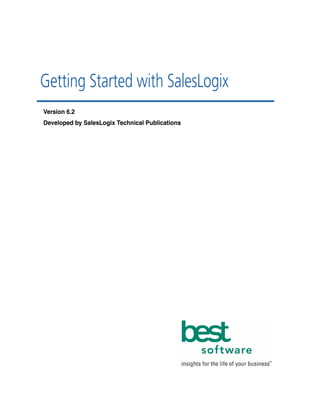 This document provides an introduction to using SalesLogix, a customer relationship management software. It describes key features such as managing contacts, accounts, opportunities and tickets; using a calendar and activities; searching and reporting; communicating with customers; and accessing the software both onsite and remotely. The guide uses scenarios to demonstrate common tasks in SalesLogix such as adding contacts and accounts, scheduling activities, managing opportunities, and working with customer service tickets. It is intended to help users begin using the core functionality of the software.