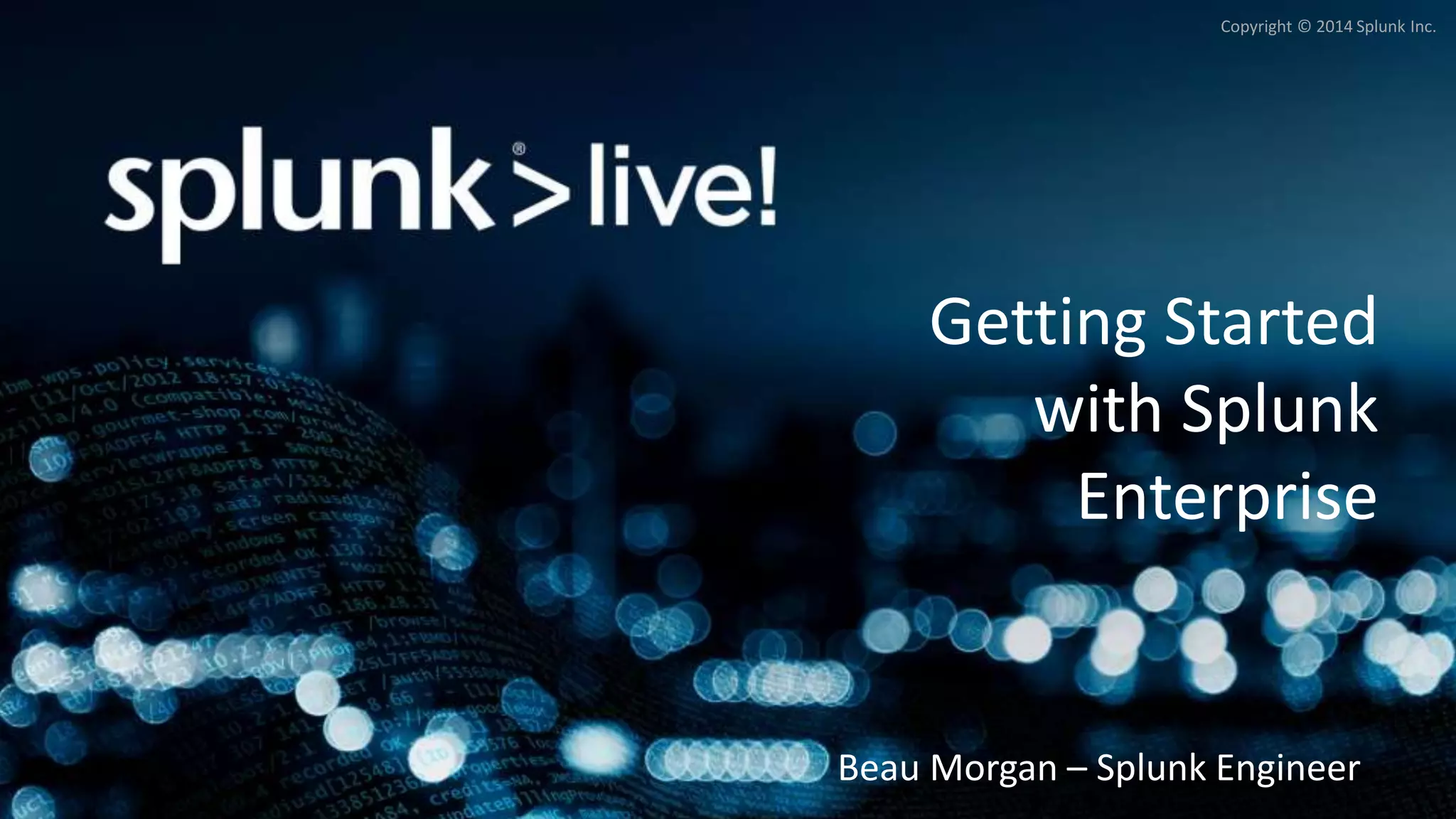 This document provides an overview and agenda for a presentation on getting started with Splunk Enterprise. The presentation covers an overview of Splunk Inc. and the Splunk platform, a live demonstration of using Splunk to install, index, search, create reports and dashboards, and set alerts. It also discusses deploying Splunk in distributed architectures, the Splunk community resources, and support options. The goal is to help attendees understand how to use the key capabilities of Splunk Enterprise.
