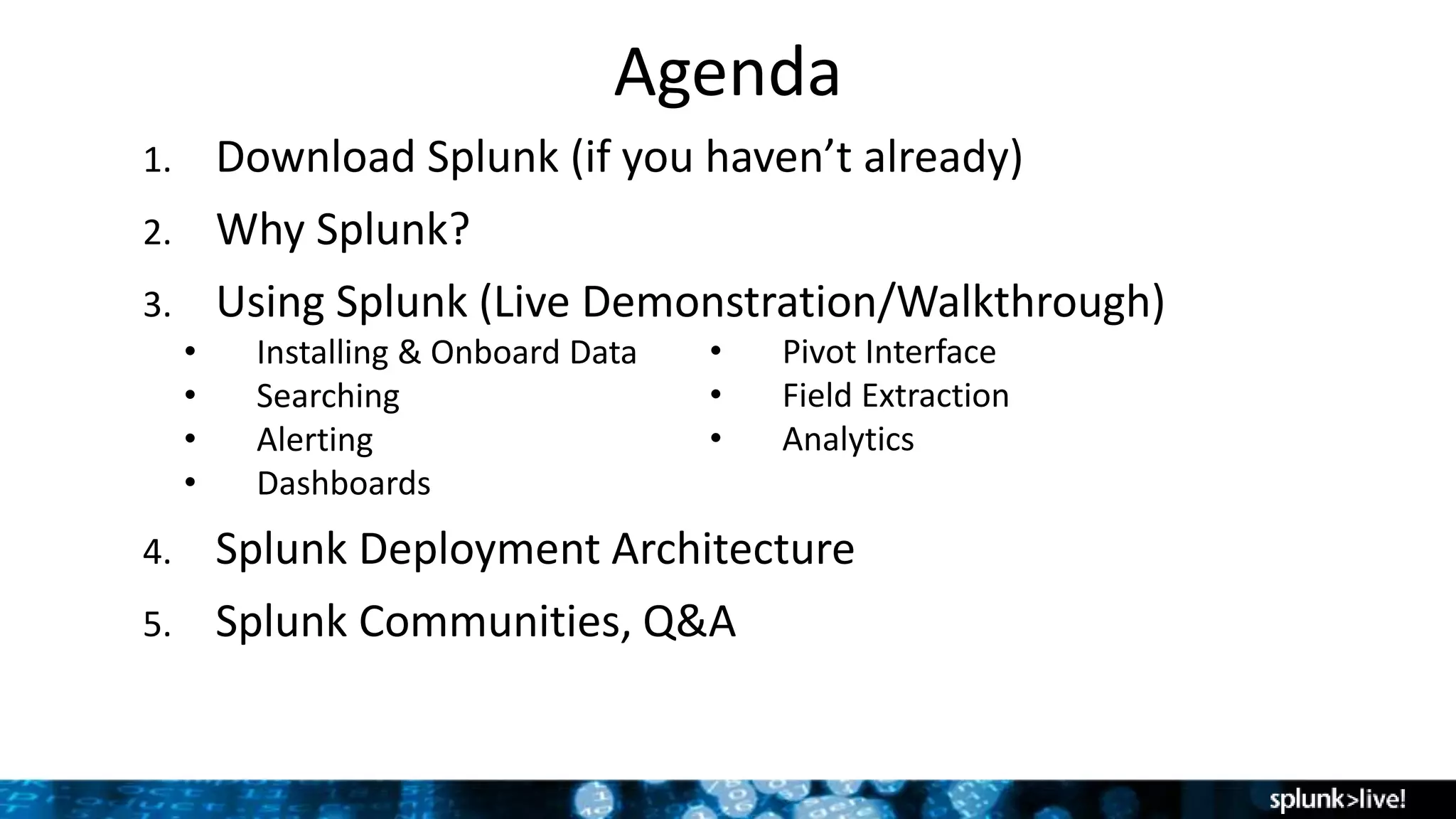 This document provides an overview and demonstration of Splunk software. It outlines an agenda to discuss why Splunk, how to install and use Splunk through a live demonstration, Splunk deployment architectures, and communities for help. The live demonstration shows importing sample data, performing searches, creating alerts and dashboards. It also discusses pivoting, field extraction, analytics, and scaling Splunk deployments.