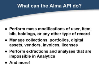The document provides an overview of using the Alma API for managing various library records, including user, item, and holdings modifications. It emphasizes the use of command-line tools like curl and xmlstarlet for interacting with the API and automation through scripting. Additionally, it offers guidance on getting started with command line usage and includes practical examples for extracting and updating records within Alma’s system.