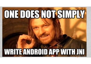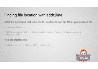 The document discusses native development for Android using the Native Development Kit (NDK). The NDK allows writing code in C/C++ and compiling it to create native libraries that can be called from Java code using JNI. It requires compiling libraries for each CPU architecture and may increase APK size. The NDK includes tools for setting up a project, configuring ABIs, debugging crashes using tombstone files, ndk-stack, and addr2line.