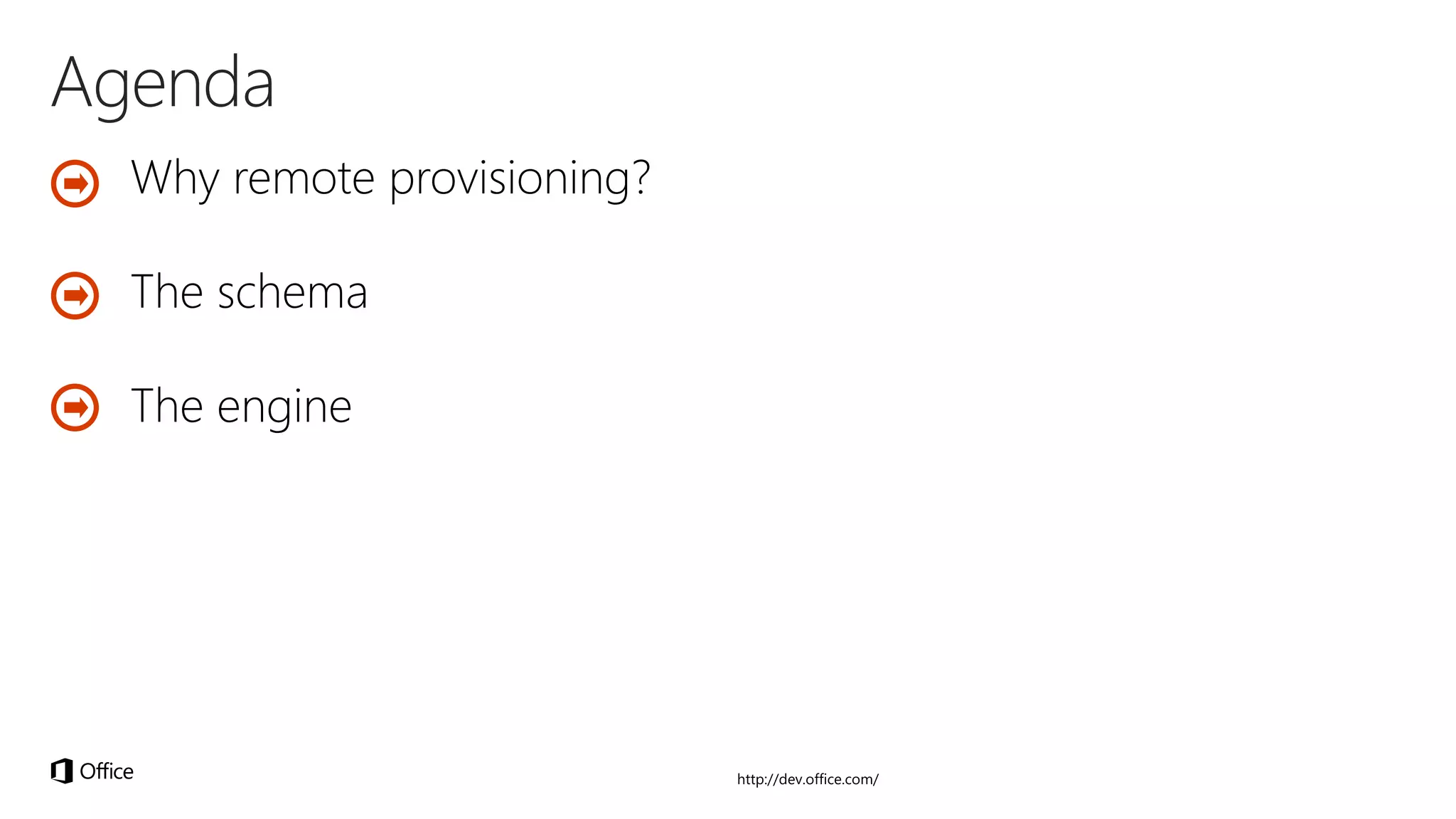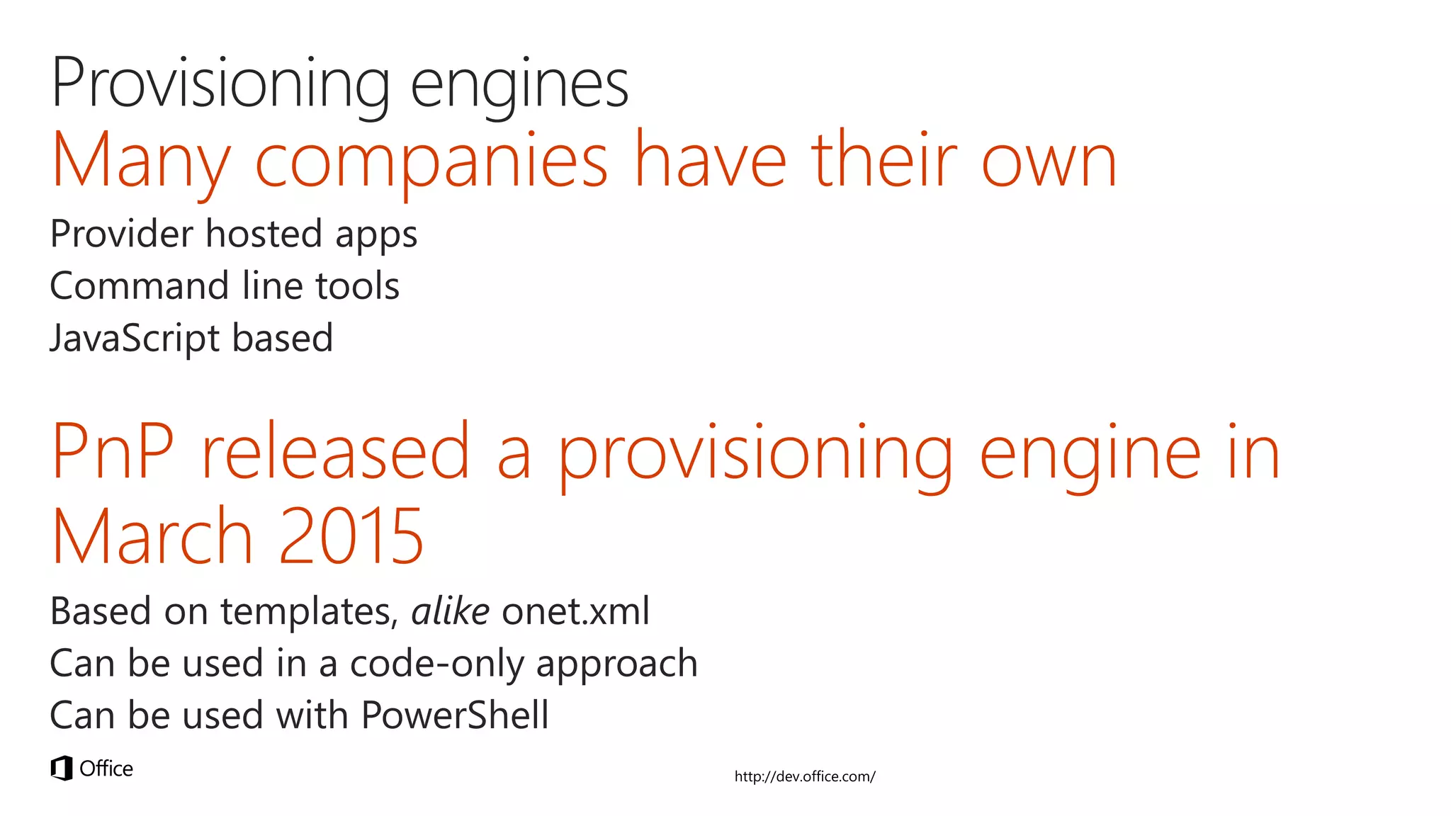 The document outlines the Office 365 Developer Patterns and Practices Provisioning Engine, presented by Erwin Van Hunen and Paolo Pialorsi, both experienced professionals in the field. It includes a brief overview of their backgrounds and certifications, as well as code snippets for saving and applying templates in a SharePoint site. The session concludes with an invitation for questions from the audience.