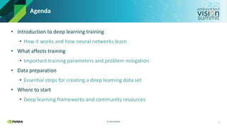 This document provides an introduction to model training for vision AI. It discusses how neural networks learn through gradient descent and backpropagation to minimize loss by adjusting weights and biases. Important factors that affect training like data preparation, hyperparameters, and preventing overfitting and underfitting are also covered. Finally, popular deep learning frameworks and community resources for learning more about machine learning are listed.