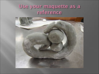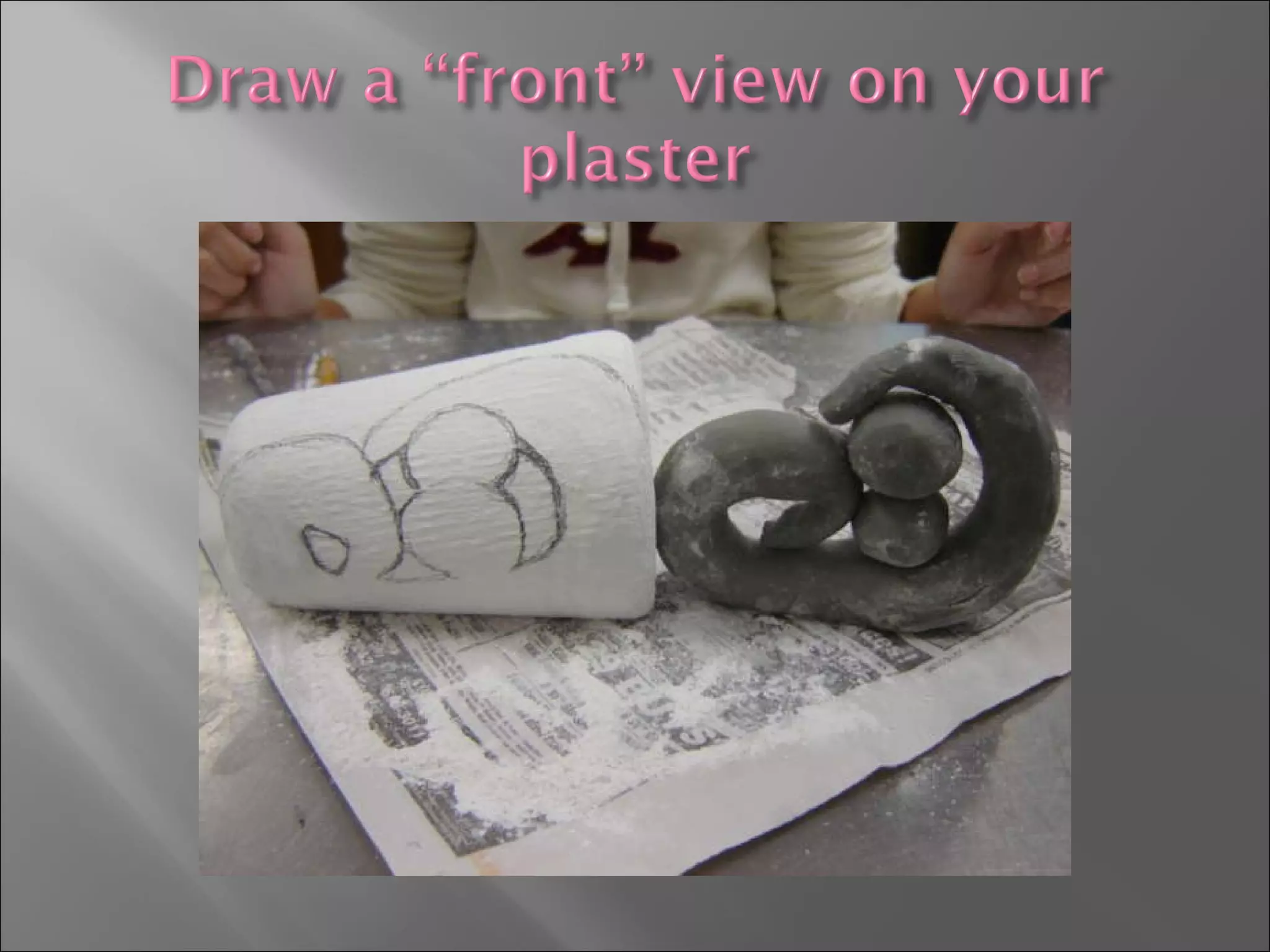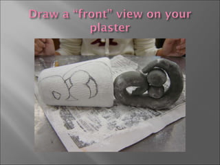 Snip the edge of a plastic cup with scissors and peel it off a piece of plaster to create a form for a sculpture. Use a soft drawing pencil to sketch the opposite view on the back of the plaster. Identify the tallest point as the top and mark the sides and bottom to plan the 3D sculpture.