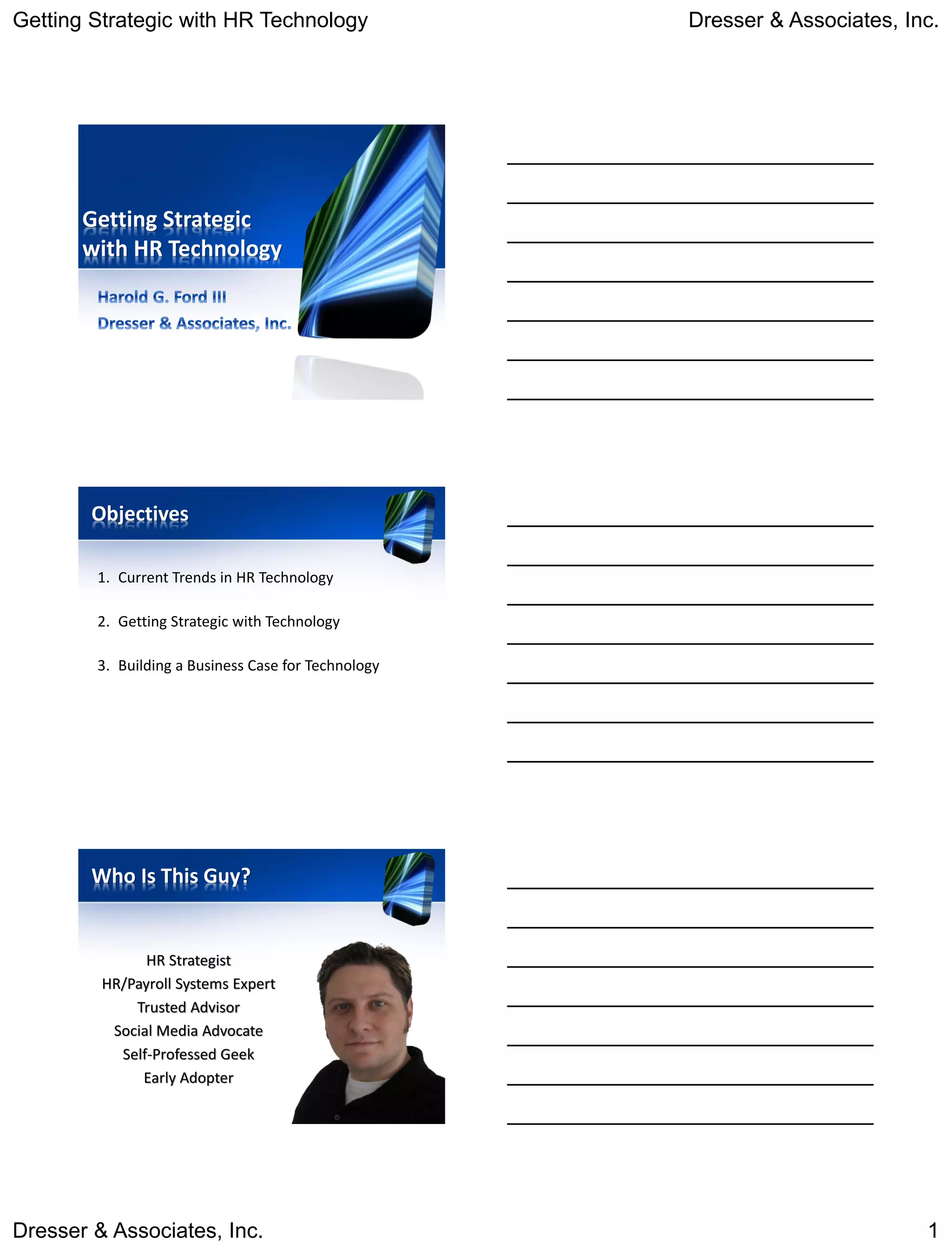 This document discusses getting strategic with HR technology. It provides an overview of current trends in HR technology including web 2.0, workforce mobility, employee self-service, talent management, and HR analytics. These trends present opportunities for HR to become more strategic and influence the business by creating analytics, improving company performance, and reducing costs. The document advocates leveraging HR technology to reduce administrative tasks and better serve business goals in order to position HR as a strategic partner.