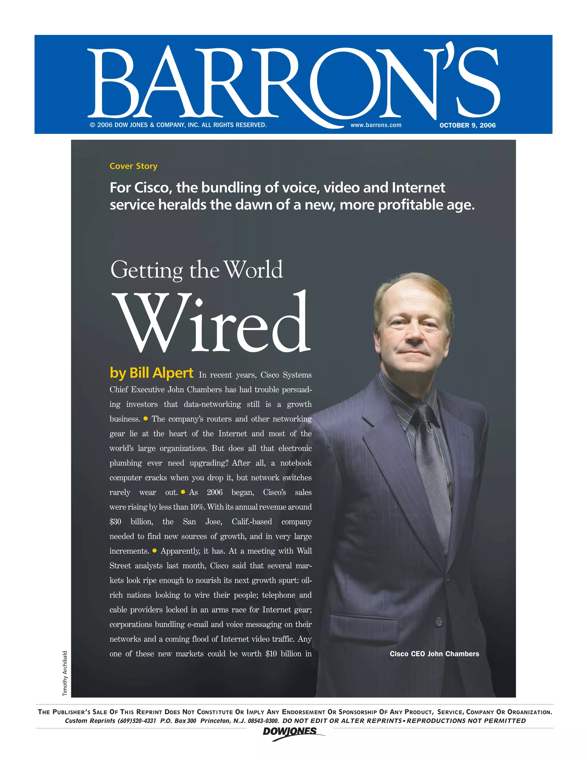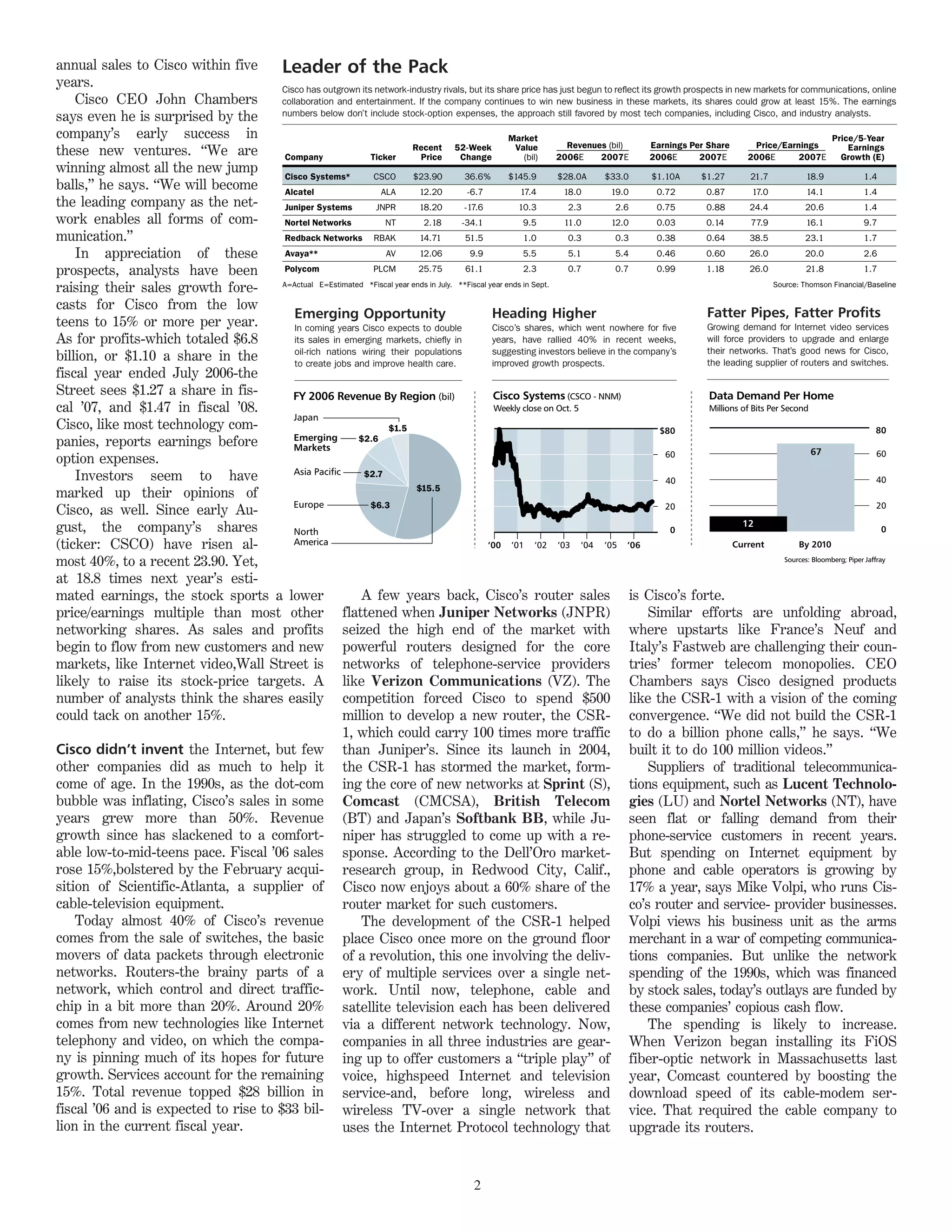 Cisco Systems is finding new growth opportunities in bundling voice, video and internet services which could each be worth $10 billion annually to Cisco within five years. Cisco CEO John Chambers notes that Cisco is winning early contracts for these new services and expects Cisco to become the leading network provider as communication increasingly moves online. Analysts have raised their sales growth forecasts for Cisco to over 15% annually through 2008 as demand grows for internet video and emerging markets invest in networking infrastructure.