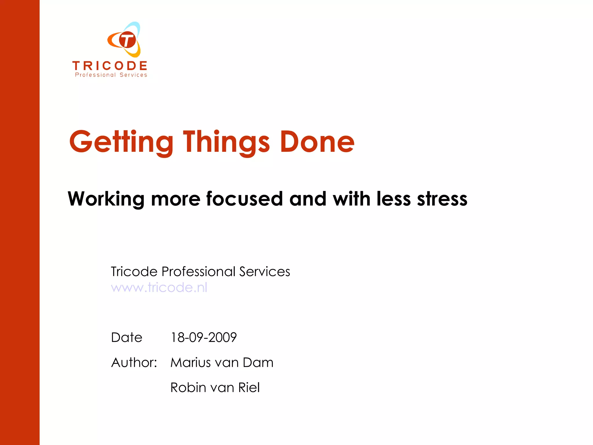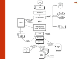 The document discusses the Getting Things Done (GTD) methodology for improving productivity and reducing stress. It originated from David Allen's book and is based on creating a reliable external system for capturing all commitments and tasks. The key aspects of GTD include collecting all open loops, clarifying actions, organizing tasks into lists by context, regularly reviewing tasks, and choosing what to engage with based on priorities. Implementing GTD can bring benefits like an complete inventory, more control, and being more focused.