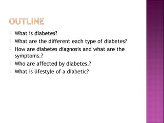 This document discusses diabetes, including the different types (Type 1, Type 2, prediabetes, and gestational diabetes), symptoms, those affected, and lifestyle management. Diabetes is caused by the body either not producing insulin or not producing enough. It can be managed through a lifestyle involving healthy food, exercise, and medication, in order to control blood sugar levels and live a long, healthy life.