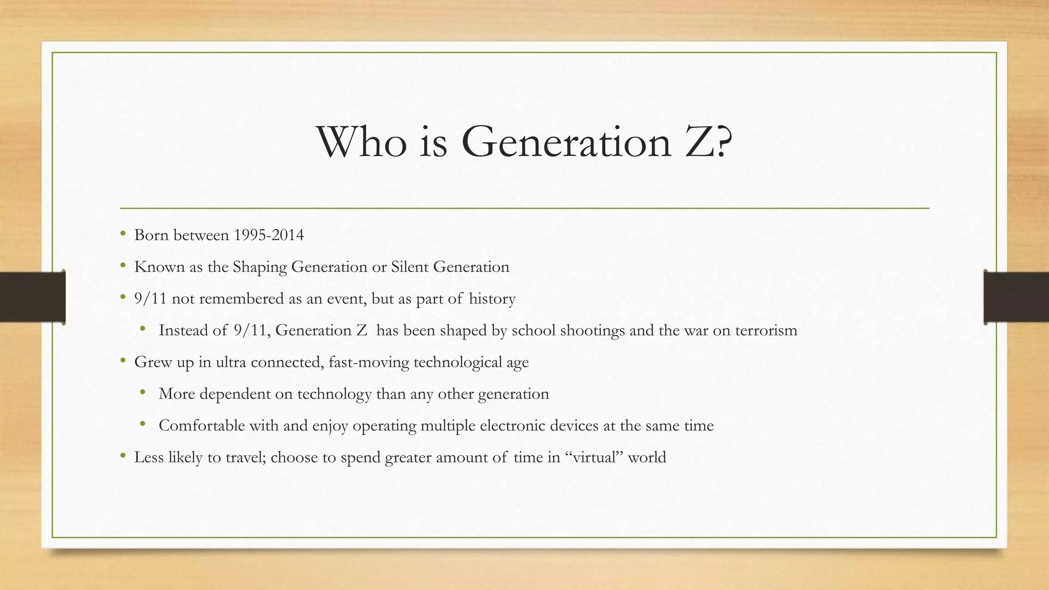 Generation Z, born between 1995-2014, has different expectations for higher education than previous generations. They are more technology dependent and rely on online learning. Generation Z sees college as a means to a good job and are cost conscious. They prefer mobile communication and "on demand" learning. Academic advisors will need to engage Generation Z using technology, provide critical information redundantly, and consider peer opinions to effectively serve this pragmatic and self-reliant generation.