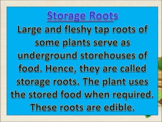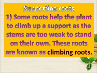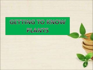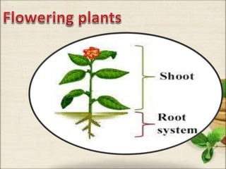 This document discusses the classification and structures of plants. It describes four main categories of plants - herbs, shrubs, trees, climbers and creepers - based on their height and stem properties. It then explains the main internal structures of plants including roots, stems, leaves, flowers and fruits. It provides examples and details on the form and function of each structure.