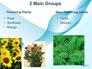 The document provides an overview of plant classification, including flowering and non-flowering plants, and various plant systems such as roots, stems, and leaves. It details the functions of these systems and their modifications, alongside processes like photosynthesis and pollination. Additionally, it mentions resources for further learning about plant life cycles.
