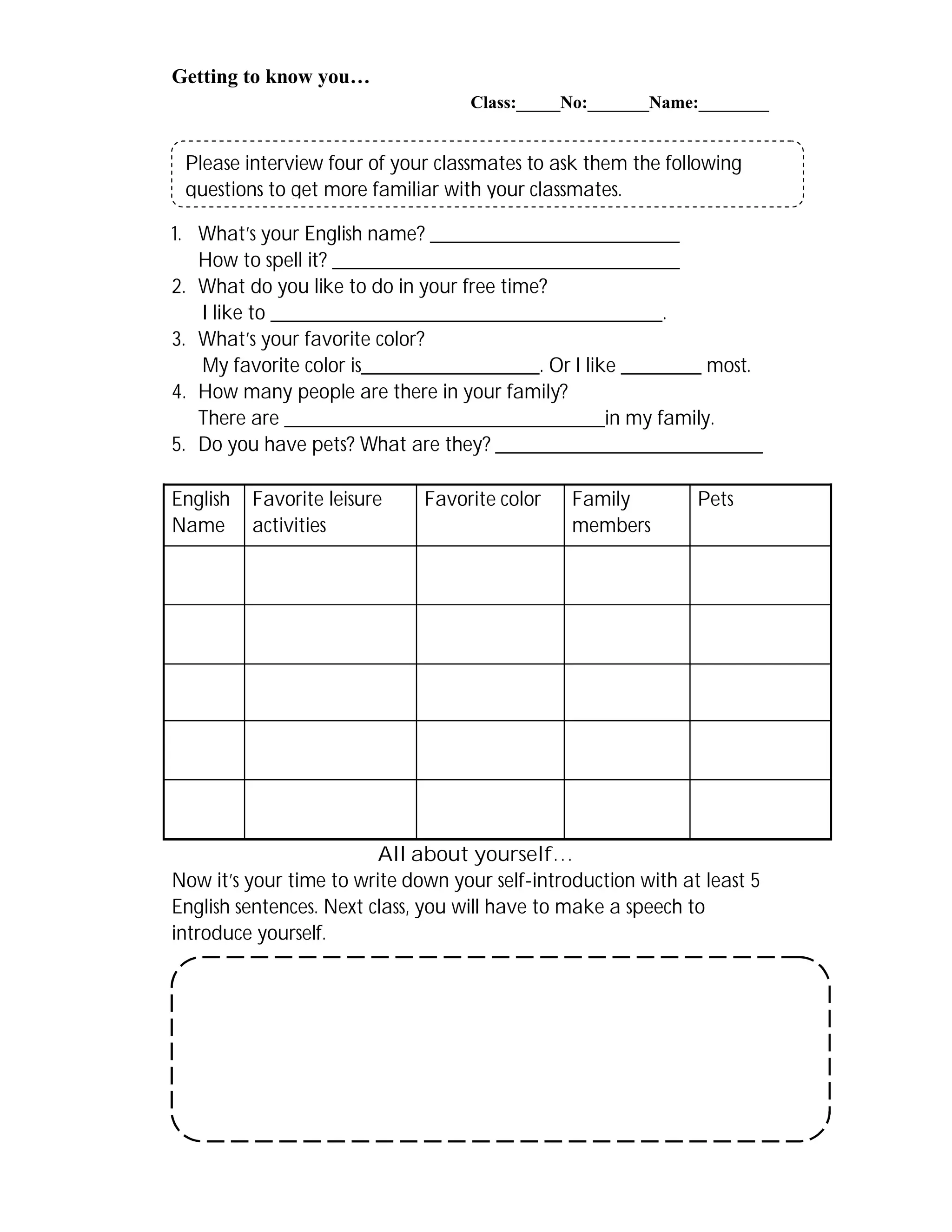 This document provides questions for students to interview four classmates to learn their English names, favorite activities, favorite colors, family sizes, and pets. It also prompts students to write a self-introduction with at least five English sentences in preparation for giving a speech about themselves next class.