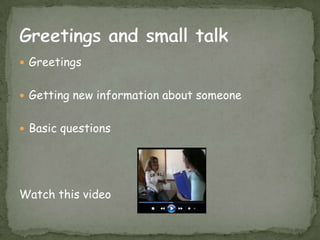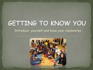 This document provides guidance on introducing yourself to classmates by learning basic information about them such as their name, hometown, age, occupation, and likes/dislikes. It recommends starting with greetings like "Hello" or "How are you?" and then asking questions to get to know them better such as "What is your name?", "Where are you from?" and "What do you like to do for fun?". The overall goal is to greet new people and get their basic details through simple questions.