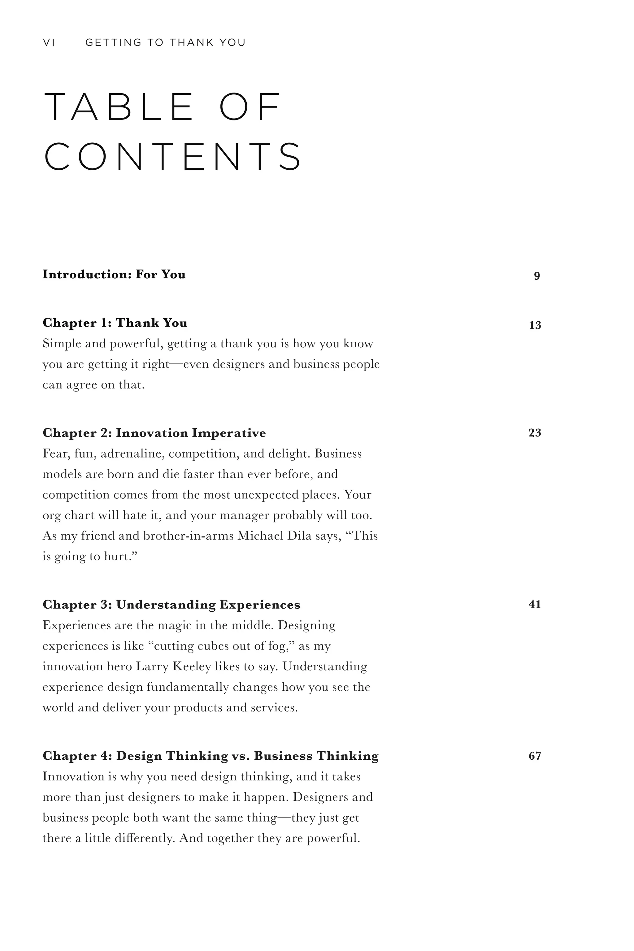 The document, 'Getting to Thank You,' explores the importance of gratitude within the context of innovation and design. It emphasizes that crafting meaningful experiences can lead customers to genuinely express their appreciation, transforming simple interactions into powerful connections. Through various chapters, the author shares insights and tools for creating impactful innovations across different fields, highlighting collaboration between designers and business leaders.