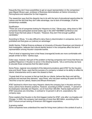 The document discusses the underrepresentation of Hispanics in high management positions in Houston, where they comprised only 2% of top executives despite being 6.6% of the labor force in 2006. Factors contributing to this disparity include limited access to education, lack of awareness about available scholarships, and potential discrimination within corporations. Efforts are underway to improve Hispanic representation through educational initiatives and programs designed to support the career advancement of Latino employees in various companies.