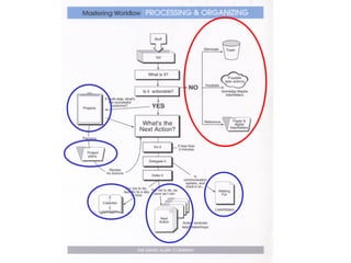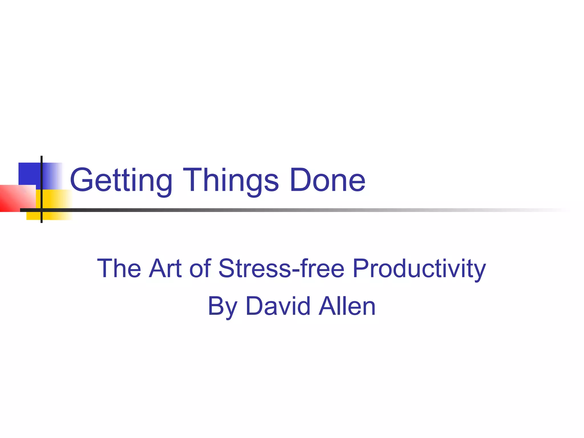Getting Things Done outlines a productivity system to help people manage their commitments and stay stress-free. It recommends capturing all tasks and projects using collection tools outside the mind, then processing them to clarify outcomes and next actions. This allows commitments to be organized and reviewed regularly so the mind remains clear and focused on forward progress.
