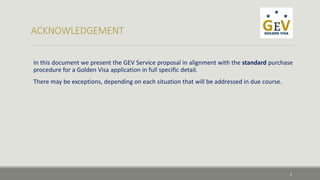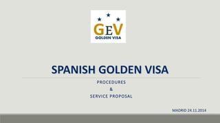 This document outlines the procedures and services for obtaining a Golden Visa in Spain through real estate, capital, or business investments. It details the requirements for each type of investment, including minimum amounts and documentation needed. It then describes the two-step process of first making the investment, then applying for the visa. Finally, it introduces GEV as a company that provides tailored services and support to clients throughout the Golden Visa application and investment process.