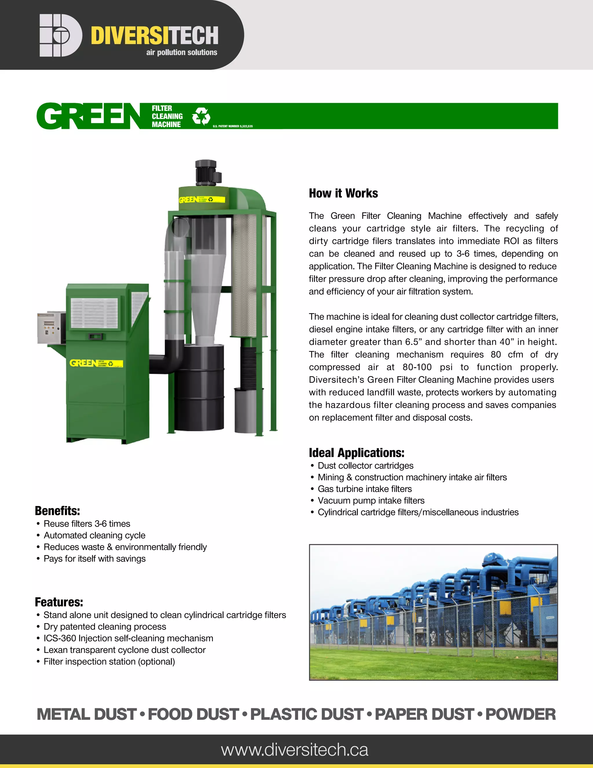 The Diversitech Green Filter Cleaning Machine effectively cleans and recycles cartridge-style air filters, allowing them to be reused 3-6 times and improving air filtration system efficiency. It automates the hazardous cleaning process, reduces landfill waste, and saves companies on replacement and disposal costs. The machine requires specific compressed air settings and is suitable for various industries, including mining and construction.