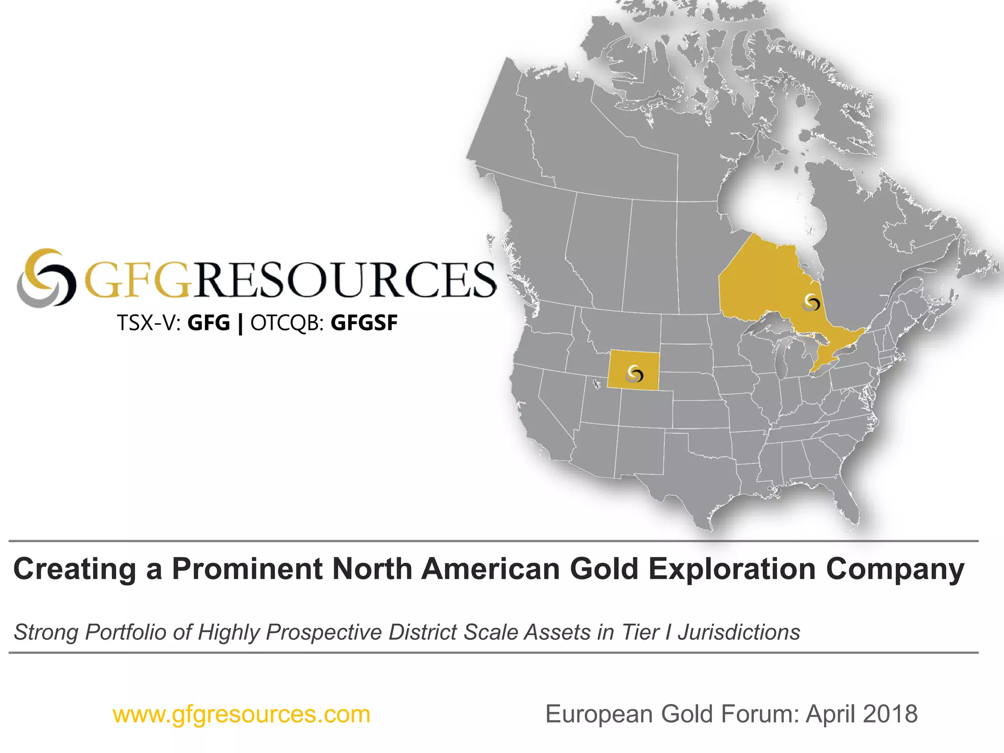 GFG Resources is a North American gold exploration company focused on district-scale projects located in tier-1 jurisdictions. It has consolidated land packages totaling over 700 square kilometers in the Abitibi greenstone belt of Ontario and in Wyoming. Upcoming exploration will include over 8,000 meters of drilling on its Pen Gold project in Ontario and geological surveys and drilling at its Rattlesnake Hills project in Wyoming, which hosts an alkaline gold system analogous to major historic mines. The company is well-funded with a strong management team and aims to become a prominent gold explorer through the development of its portfolio of highly prospective assets.