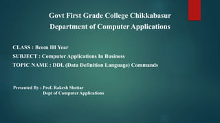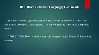 The document discusses DDL (Data Definition Language) commands used to create, alter, and drop database tables. It defines key DDL commands like CREATE TABLE, ALTER, DROP, TRUNCATE, and DESC. CREATE TABLE is used to define a new table, ALTER modifies an existing table, DROP removes a table, TRUNCATE deletes all rows but keeps the table structure, and DESC describes the structure of a table. Examples are provided for each command.