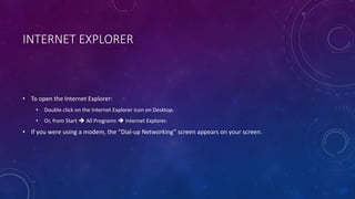 Internet Explorer can be opened by double clicking its desktop icon or through the Start menu. The main components of the Internet Explorer window include the title bar, menu bar, toolbar, and address bar. The toolbar contains standard icons like Back, Forward, Stop, Refresh, Home, Search, Favorites, History, Mail and Print. Every webpage has a unique web address called a URL made up of the protocol, domain name, and top level domain name indicating the type and country. Common top level domains include .com, .org, .net, .gov, .mil, and .edu. Users can access websites by typing the URL in the address bar or clicking on links. Toolbars can be shown or hidden and