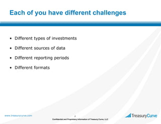 The document discusses challenges faced by treasurers in managing investments, emphasizing the need for effective communication and streamlined access to data. It outlines various options for cash investments, including institutional money market funds, and highlights the benefits of using a money fund portal for efficiency and transparency. Additionally, it provides guidelines on what to look for in a service provider, such as experience, technology, and independence.