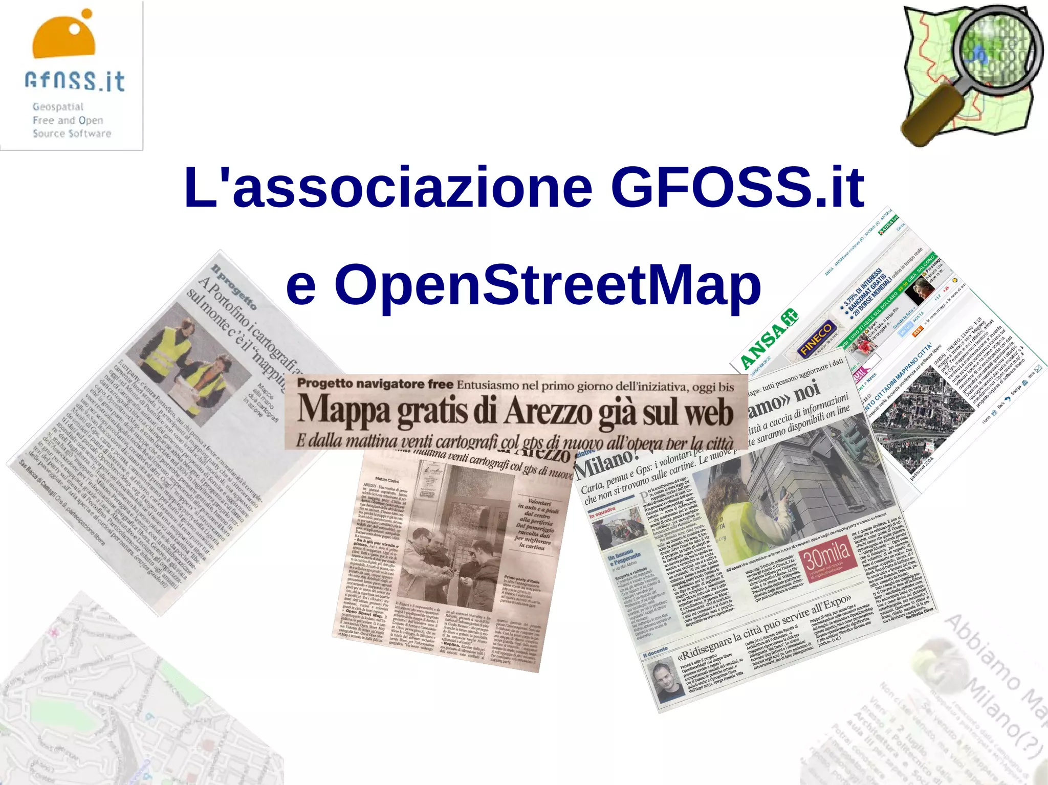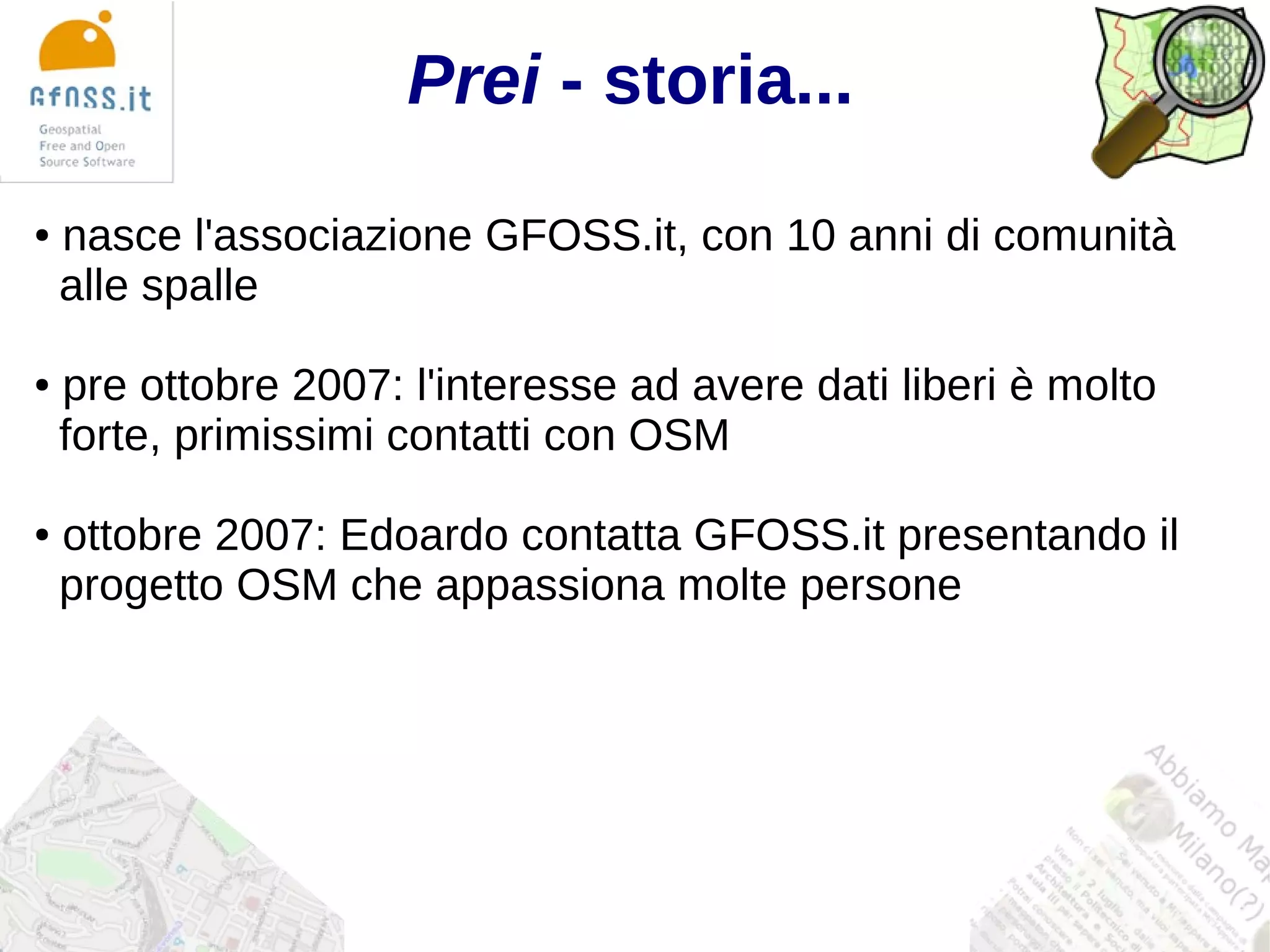 L'associazione gfoss.it è nata con un forte interesse per i dati liberi e ha collaborato con OpenStreetMap (OSM) sin dalla sua fondazione nel 2007. Ha organizzato eventi e attività per promuovere la mappatura e la liberazione dei dati, cercando di coinvolgere comunità meno tecnologiche e locali. Il futuro dell'associazione prevede ulteriori eventi, sviluppo di software e collaborazioni con OSM per espandere la libertà dei dati geografici.