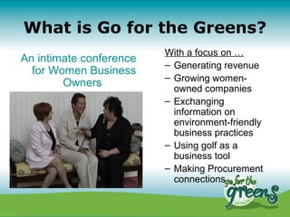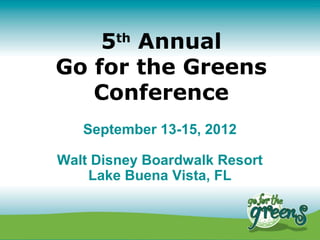 The 5th annual Go for the Greens conference will take place September 13-15, 2012 at the Walt Disney Boardwalk Resort in Lake Buena Vista, FL. The goal is to connect women business owners to corporations, government agencies, and non-profits to do business together through networking opportunities, procurement matchmaking, and breakout sessions on topics like taxes, leadership, and international business. Highlights include an expo hall, partnerships with other women's organizations, and attendance capped at 250 to foster relationships. Procurement representatives from companies like CHEP, Ernst & Young, and Walt Disney World will attend.