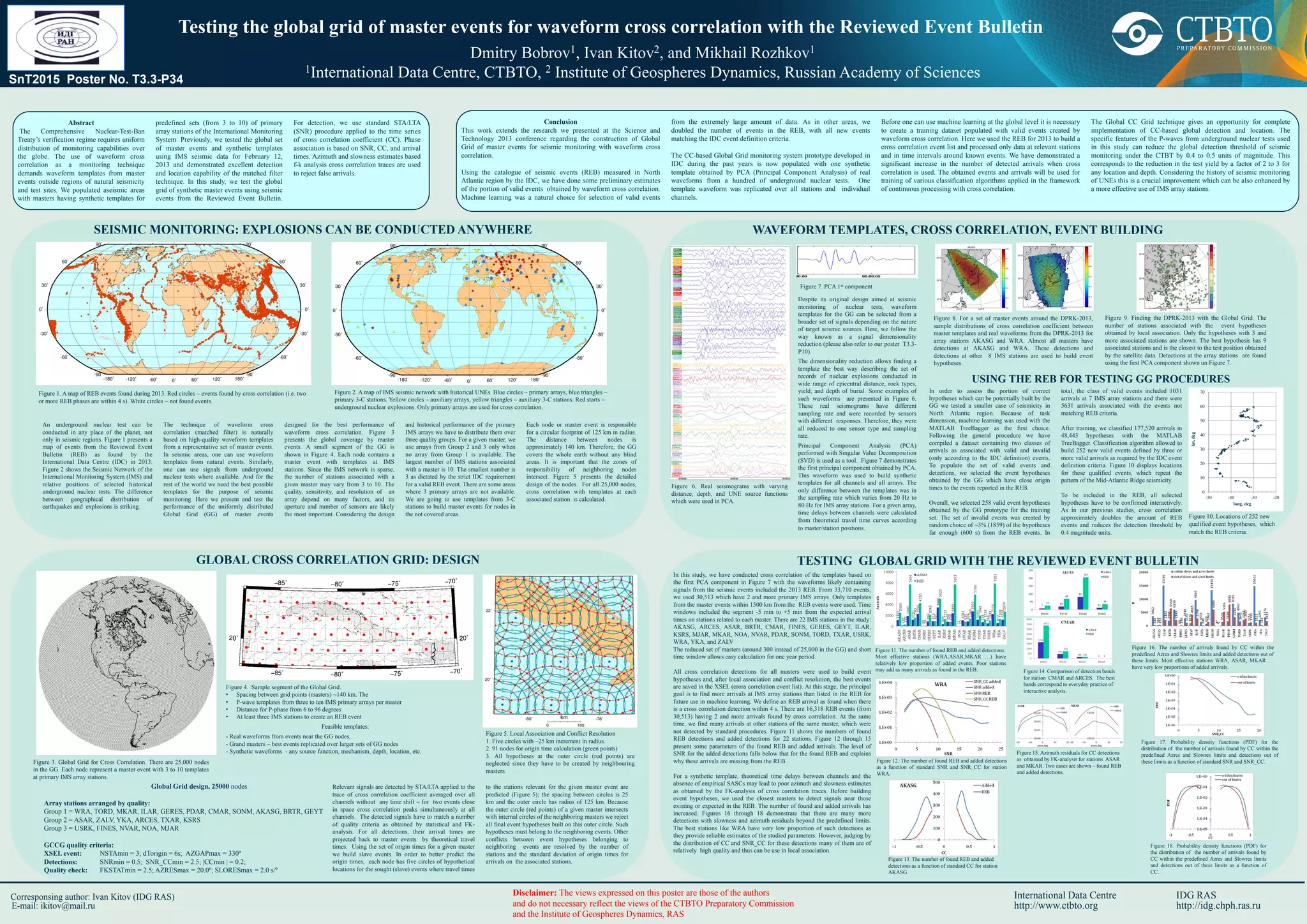 This document presents the testing of a global grid of master events for seismic monitoring through waveform cross-correlation. The study enhances previous research by populating aseismic regions with synthetic templates and demonstrates the efficacy of using machine learning to classify seismic events, ultimately increasing the detection and categorization of events related to nuclear tests. The technique is designed to improve detection thresholds and reduce false alarms, showcasing significant advancements in global seismic monitoring capabilities.