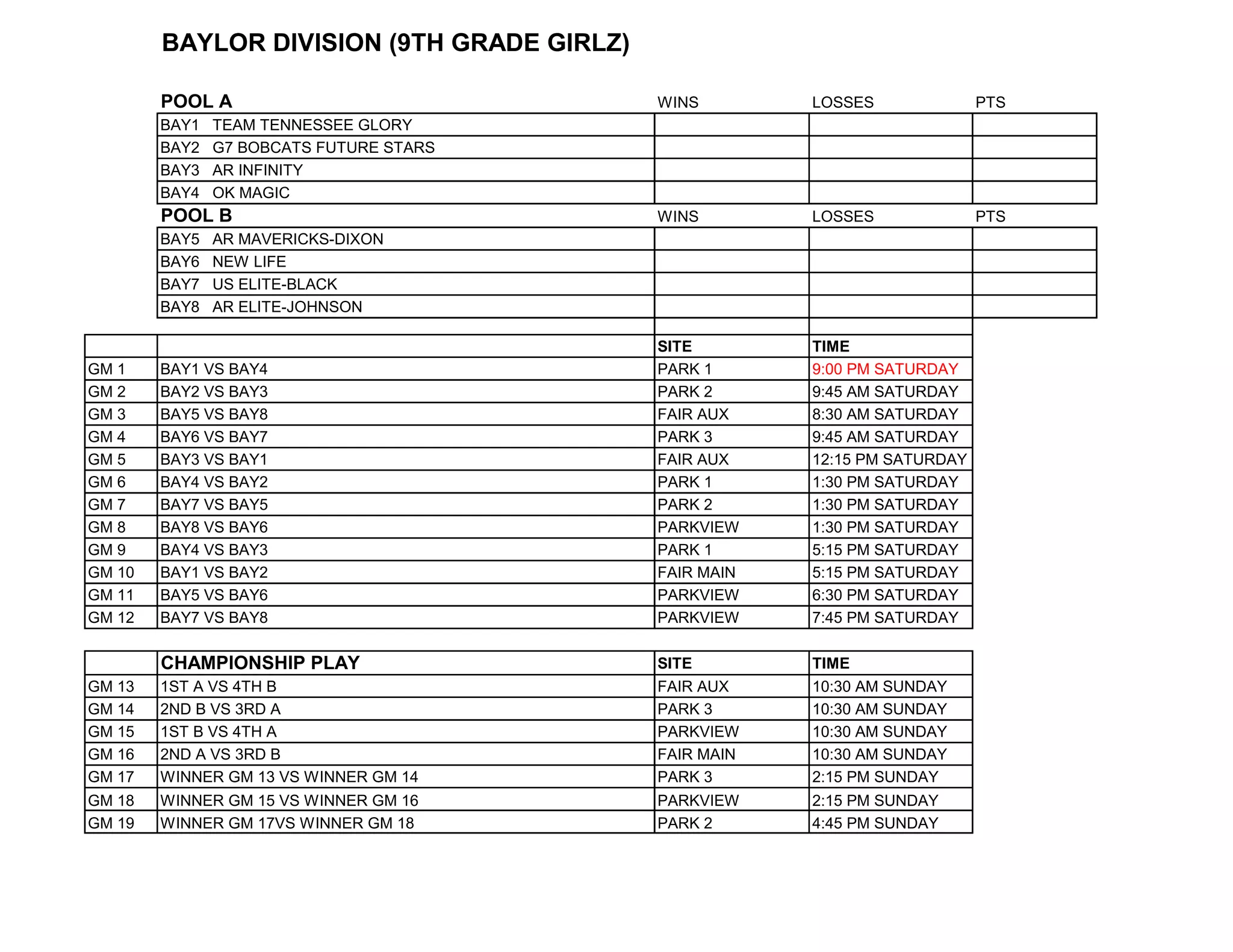 The document contains a schedule for a 9th grade girls' basketball tournament with two pools (A and B). Pool A contains teams Bay1 through Bay4 and Pool B contains teams Bay5 through Bay8. The schedule lists the matchups between teams in each pool to determine pool standings on Saturday, as well as the championship bracket games on Sunday to determine the overall tournament winner.