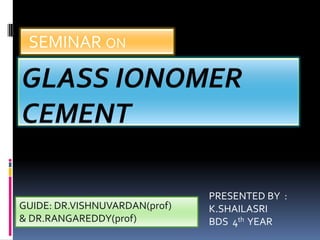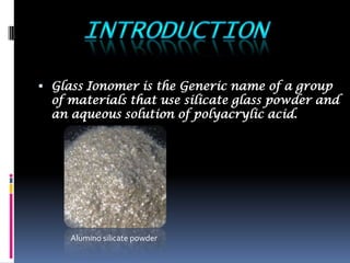 Glass ionomer cement is a dental restorative material that uses glass powder and an aqueous solution of polyacrylic acid. It has several advantages like adhesion to tooth structure, biocompatibility, and continuous fluoride release. Glass ionomer cement has applications as luting agents, restorative materials, liners, and bases. It has adequate physical properties for these uses but is more brittle than other restorative materials.