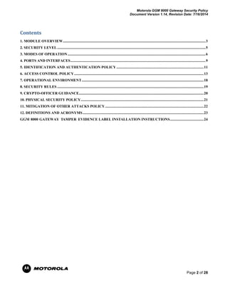This document provides a security policy for the Motorola GGM 8000 Gateway cryptographic module. It summarizes the module's validation under FIPS 140-2 as a level 2 device. The document outlines the module's approved and non-approved cryptographic algorithms, modes of operation, and steps required to enter FIPS compliant mode. Physical security measures and roles are also described.