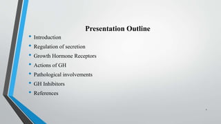 Growth hormone is secreted by the anterior pituitary gland and regulates postnatal growth, protein synthesis, and metabolism. Its secretion is controlled by the hypothalamus through growth hormone-releasing hormone and growth hormone-inhibiting hormone. Growth hormone binds to receptors on target tissues and activates the JAK-STAT pathway to promote growth, increase fat metabolism, and influence protein and carbohydrate metabolism. Abnormal growth hormone secretion can cause gigantism, acromegaly, or dwarfism. Somatostatin and octreotide inhibit growth hormone secretion and are used to treat acromegaly.